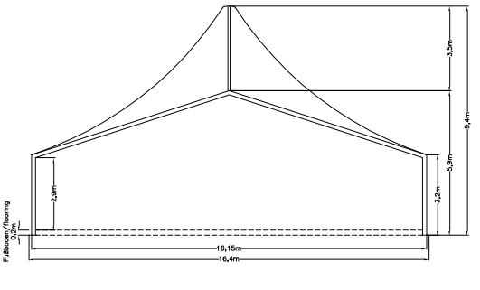 Desweiteren gehen wir davon aus, dass die Industriezelthalle einzeln steht (kein Anbau an Bestandsgebäude o.ä.) und umlaufend um die Hallengrundfläche ein Montagestreifen (befahrbar mit selbstfahrenden Scherenbühnen und Gabelstapler) von mindestens 2,50 m vorhanden ist.