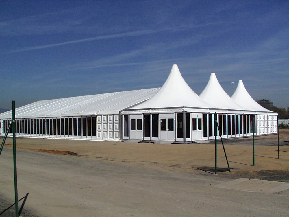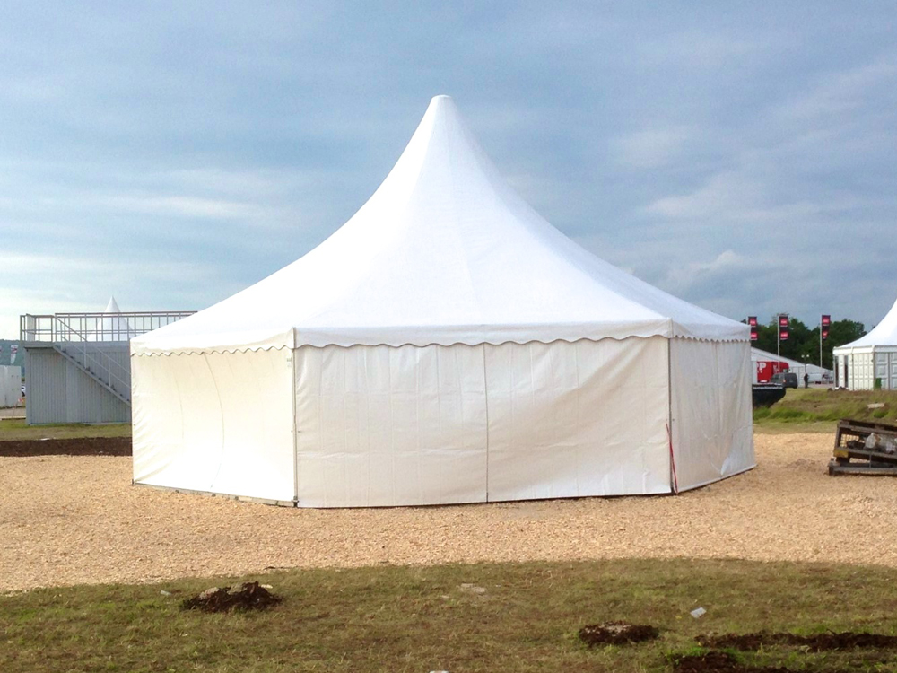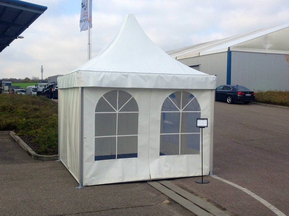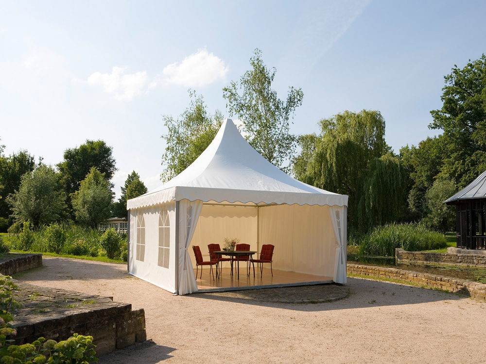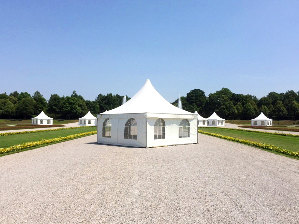 Eine Pagode ist ein Spitzdach-Zelt mit quadratischer Grundfläche. Dem Einsatzzweck sind keine Grenzen gesetzt. Pagoden können einzeln, aber auch als Verbund aufgebaut werden. Egal ob als Empfangs-, Buffetzelt oder Verkaufsstand, die Pagode ist ein echter Blickfang.