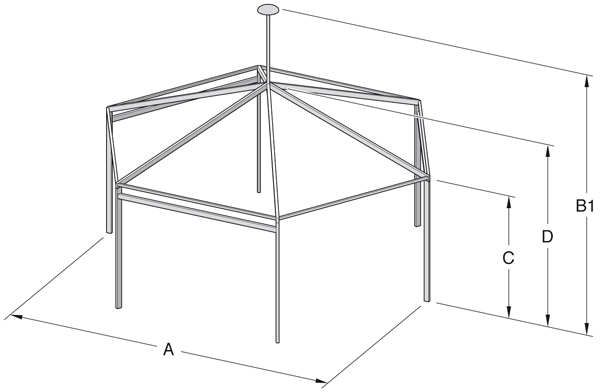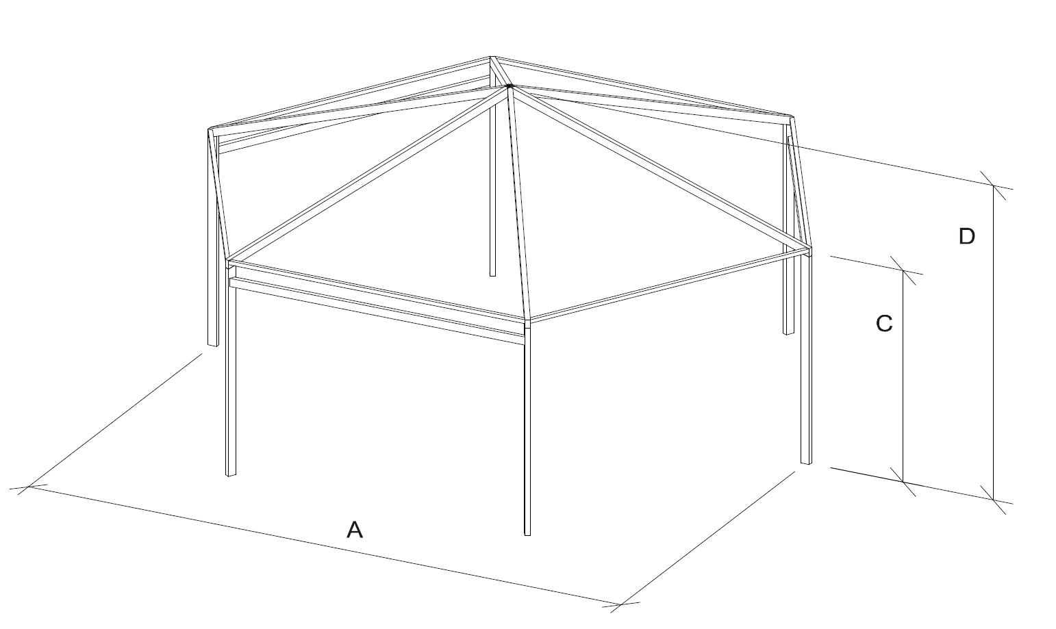 Der Pavillon hat einen 6-eckigen Grundkörper und eher eine satteldachähnliche Dachform.