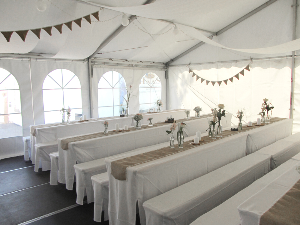 Glatt gespannter Nesselstoff (weiß) im inneren Dach- und Giebeldreiecksbereich des Zeltes gespannt, um den Innenraum des Zeltes optisch aufzuwerten. Auf Wunsch sind auch die Ausführung „gerafft“ oder weitere Farbvarianten (gegen Aufpreis) möglich.